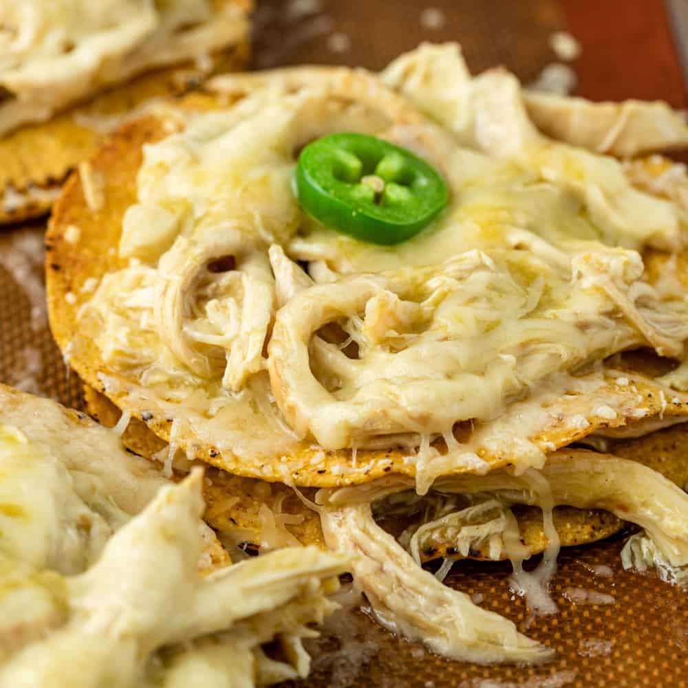 - Place 6 tostada shells on lined baking sheet. Divide half the green chile chicken over the first layer of shells. Top each with a third cup of cheese and repeat with another layer of tostada shells, both green chile chicken and cheese.