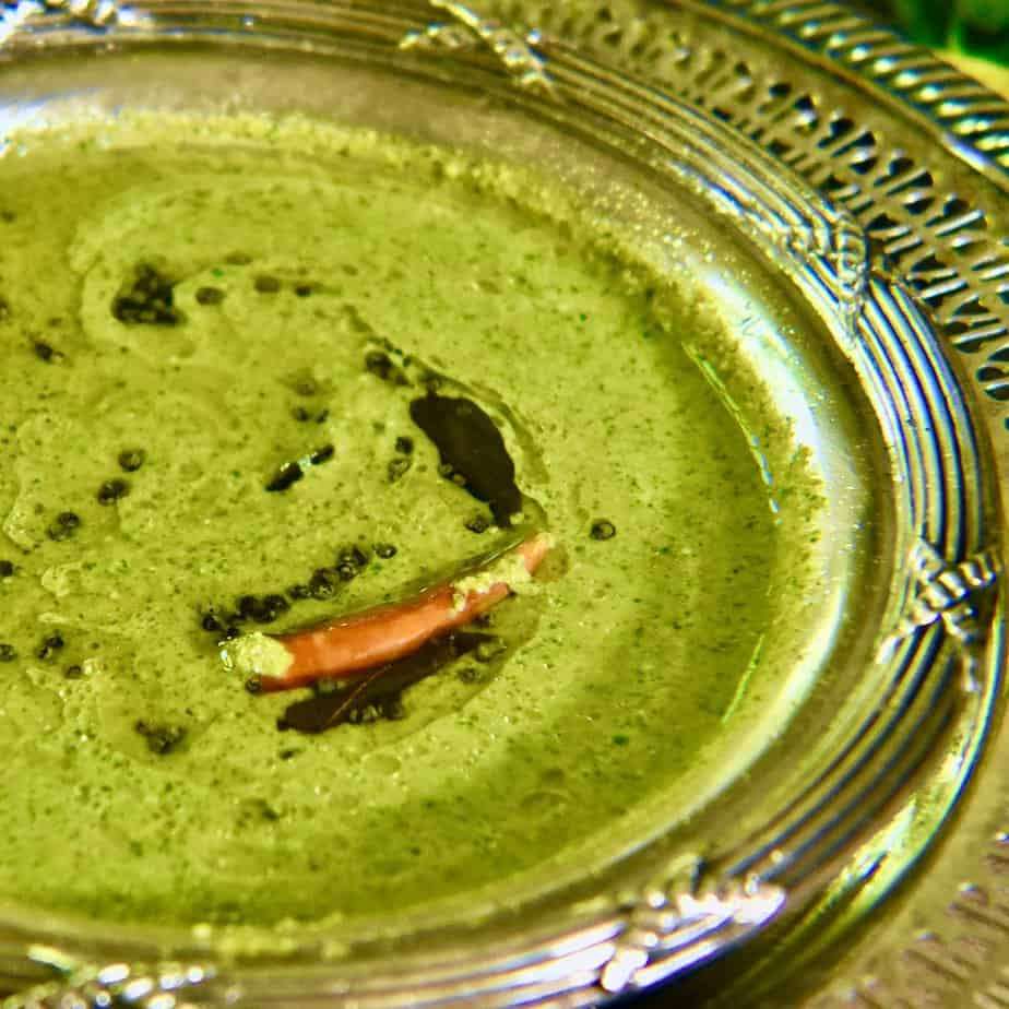 Green Coconut Chutney. Peanuts, coconut, tamarind and cilantro coupled with spices make this the perfect accompaniement for any snack.