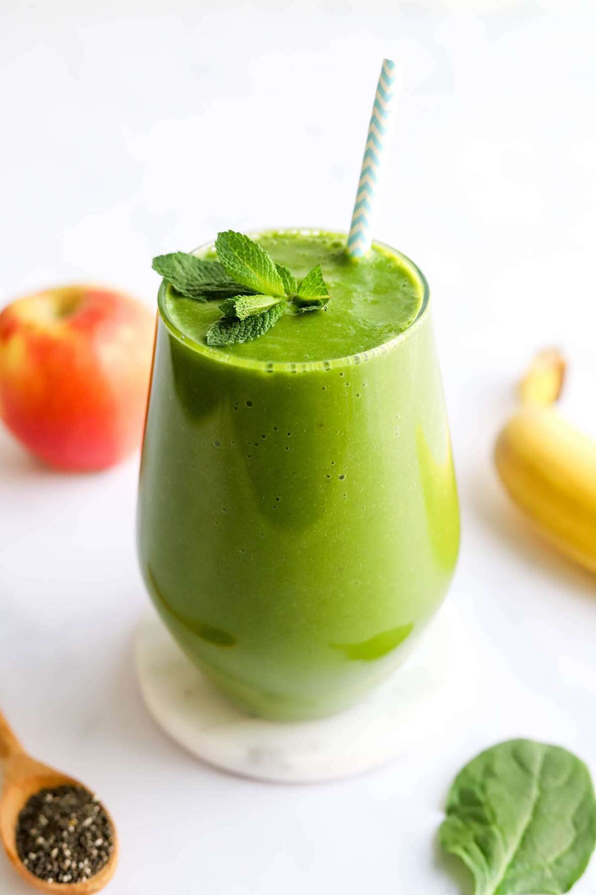 - Add the lemon, banana, apple, ginger, mint and chia seeds. Blend on high until banana has been completely pureed and the mixture is smooth.