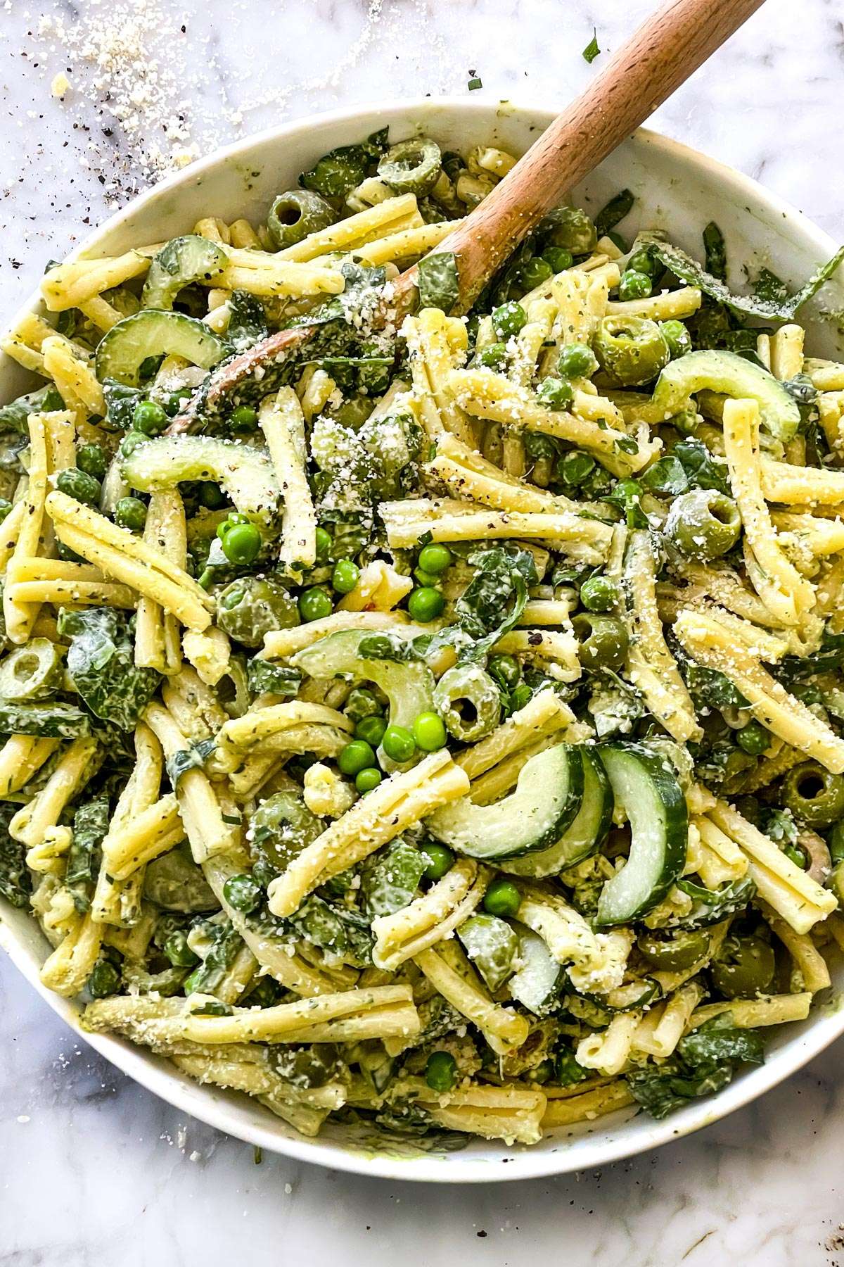 This green goddess pasta salad is bright and tangy, cool and creamy, and loaded with green veggies. It's vegetarian too, making it an excellent contribution to any potluck, picnic, or BBQ.