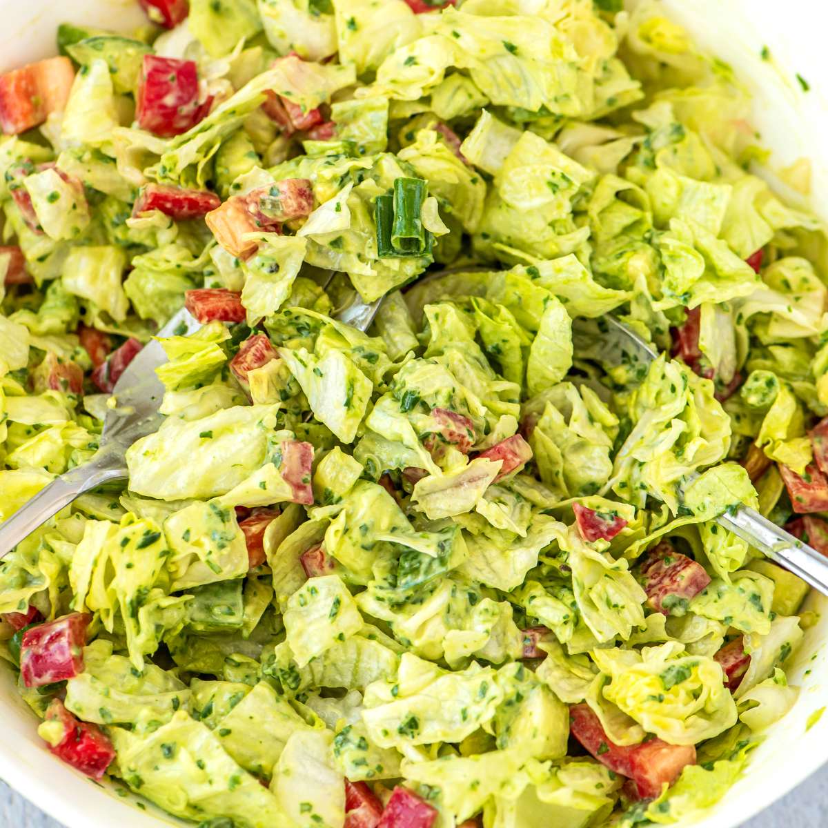 Fresh green goddess salad is a mx of green vegetables blended into a creamy dressing, then lightly tossed with a simple green salad. Enjoy as a main dish or side to any meal.