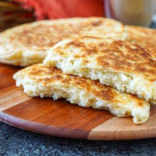 - Roll the first disk into a larger circle, about the size of your skillet. (I used a 10-inch, 25cm, skillet, rolling them into 8-inch, 20cm, circles.) Brush the skillet with a lashing of olive oil and drape the flatbread in the pan. Let cook for 2 minutes on the first side, or until browned and blistered, then turn the flatbread over and cook the other side until it’s blistered as well, about another 2 minutes. While you’re cooking one flatbread, start rolling out the next one and continue with the rest of the circles of dough, brushing the pan with oil between frying each flatbread.