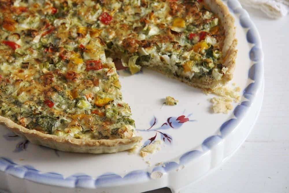 A wonderful, easy quiche with cheese and green onions, perfect for brunch, a picnic, or another casual gathering with friends.