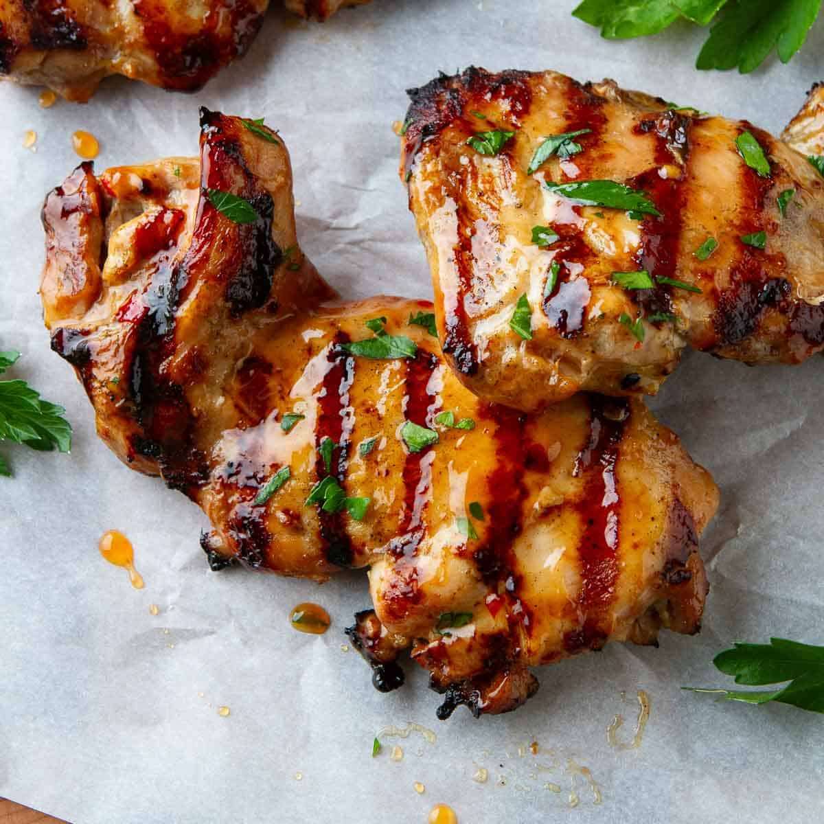 Grilled chicken thighs have never tasted so good! These ones are marinated, grilled with the perfect amount of char and finished with a sweet chili glaze.