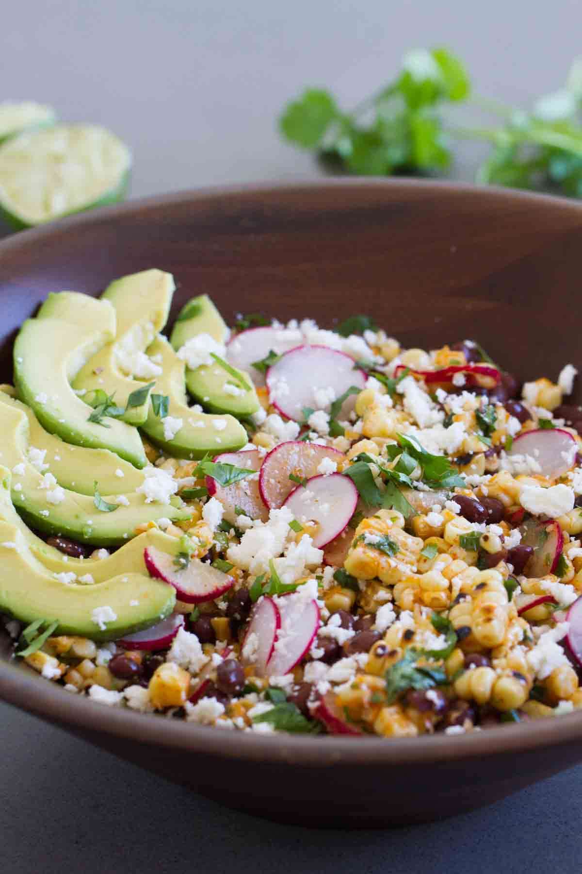 This Grilled Corn and Black Bean Salad is the perfect meat-free summer meal - with grilled corn, black beans, radishes, green onions, cilantro, queso fresco and avocados.