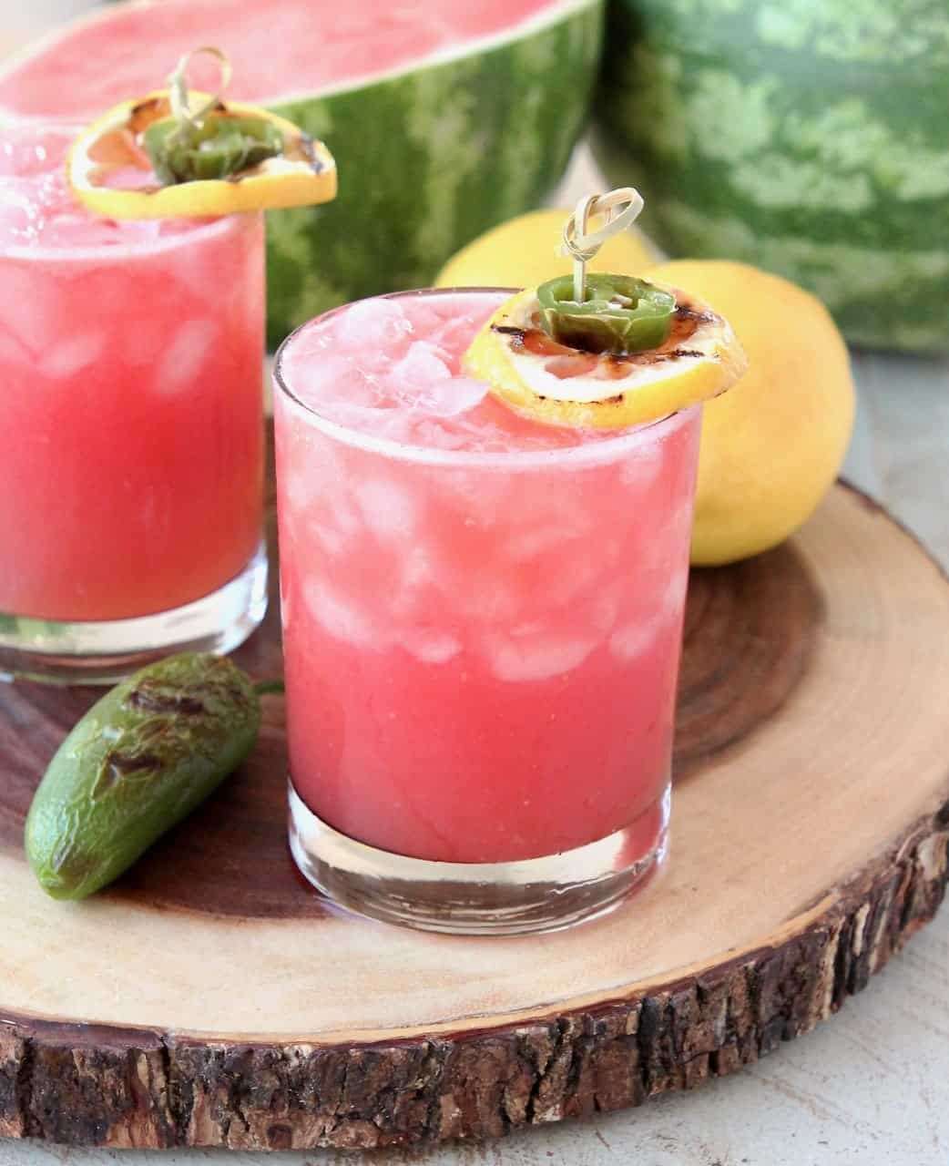 - Divide the blended watermelon juice between two glasses filled with ice. Add ½ oz lemon juice, 1 ½ oz tequila and 1 oz grilled jalapeno simple syrup to each glass.