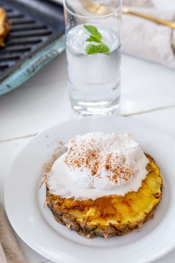 This grilled pineapple with cinnamon coconut whipped cream is so easy, fast, and healthy. It tastes like pineapple upside down cake without the cake.