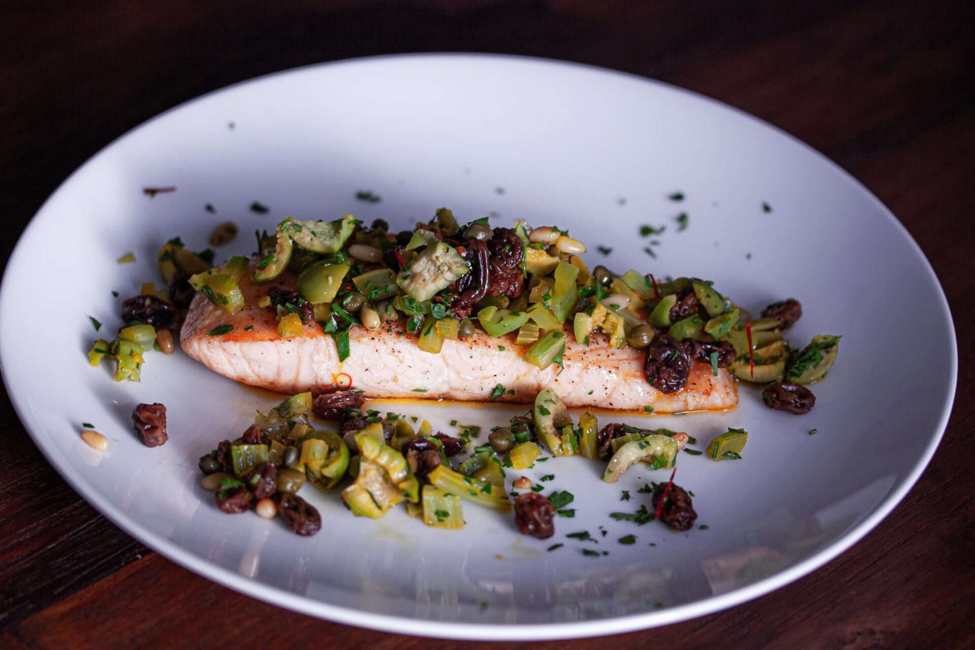 - Place a salmon fillet on each dish and arrange generously the olive sauce over it.