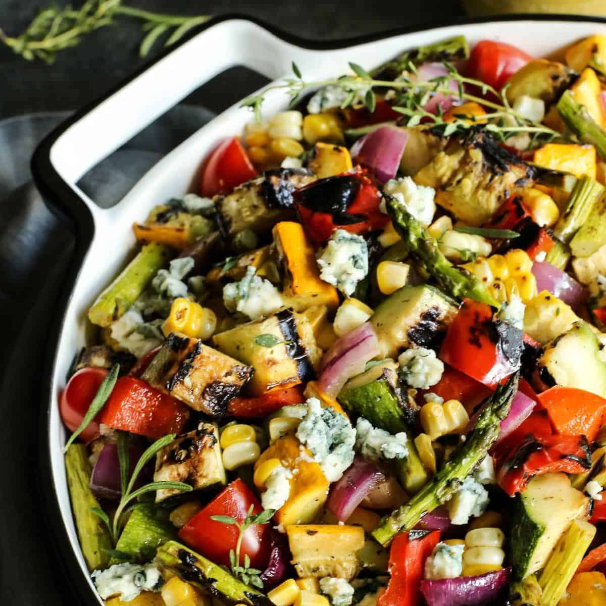 This Grilled Vegetable Salad recipe has perfectly charred vegetables dressed with a sunny, herby lemon vinaigrette. Bites of creamy, salty blue cheese (or substitute Parmesan) are the finishing touch!