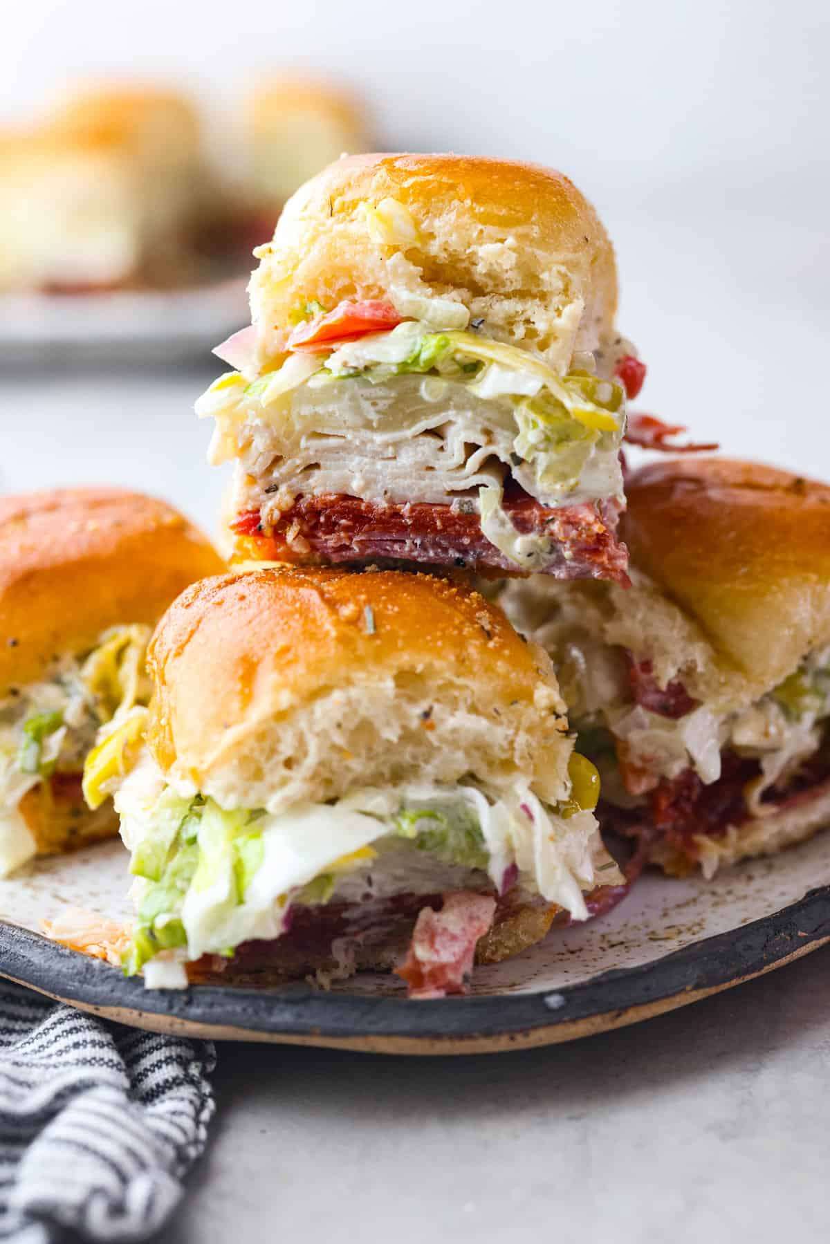 The classic grinder sandwich made into sliders to share! You've got Hawaiian rolls topped with layers of pepperoni, salami, turkey, provolone, and creamy grinder salad. And to top things off- each roll is brushed with a buttery parmesan glaze and baked to golden brown perfection.