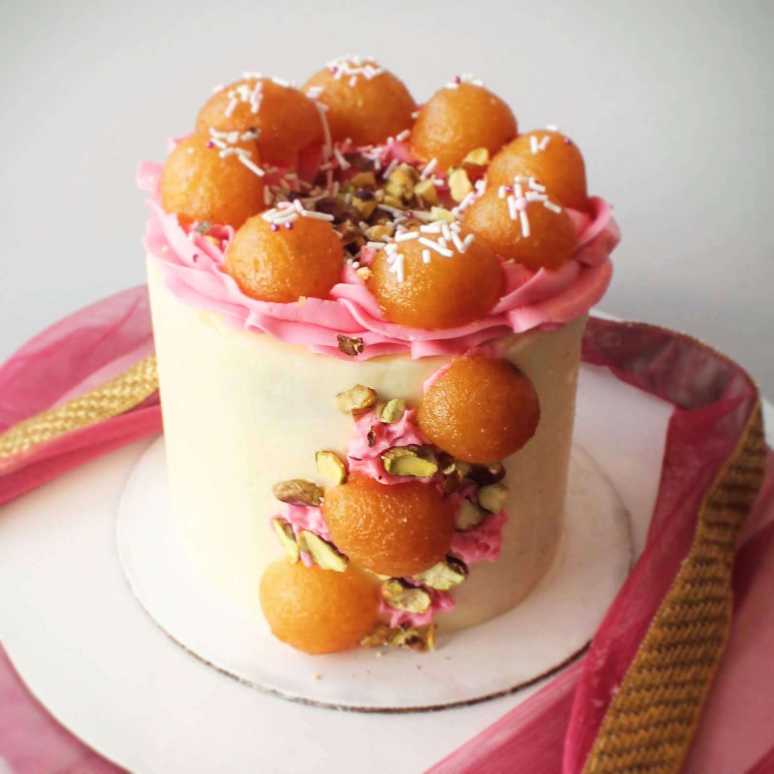 - Using a Wilton 1M tip, pipe pink frosting around the top of the cake. Place 8 gulab jamun halves on top of the border face down.