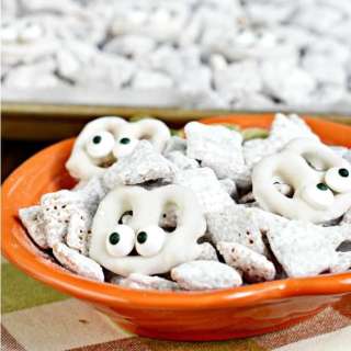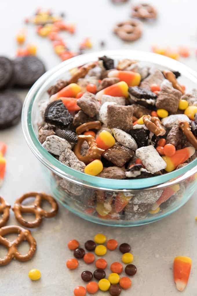 This Halloween Chex Mix Muddy Buddies (aka Puppy Chow) recipe is chock-full of October delight - a little salty, a lotta sweet, with crunchy and chewy textures in each handful thanks to the addition of pretzels, candy corn, chopped Oreos, and Reese's Pieces.