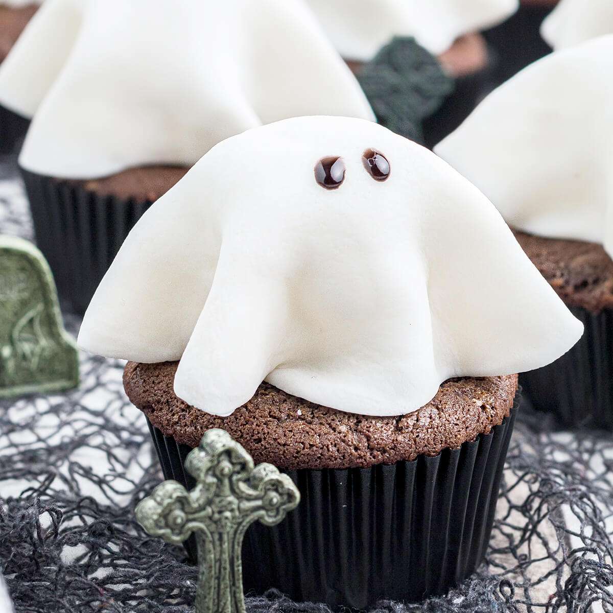 Use this simple chocolate cupcake recipe and purchased fondant to make these adorable Halloween Ghost Cupcakes to serve to all your trick-or-treaters!