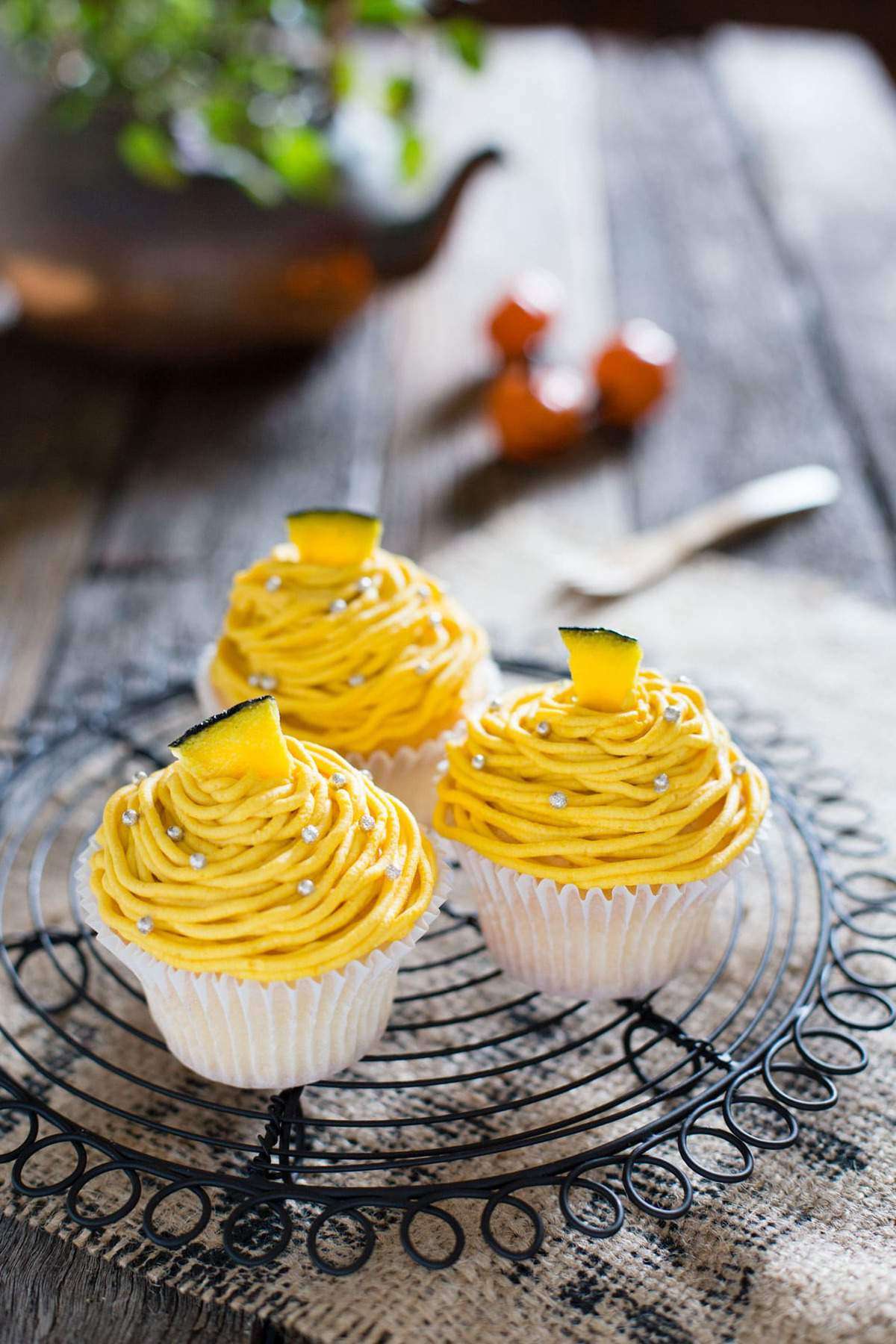 Halloween pumpkin mont blanc cakes are Japanese cakes with delicious pumpkin cream topped resembling the glistening white mountain peak of Mont Blanc