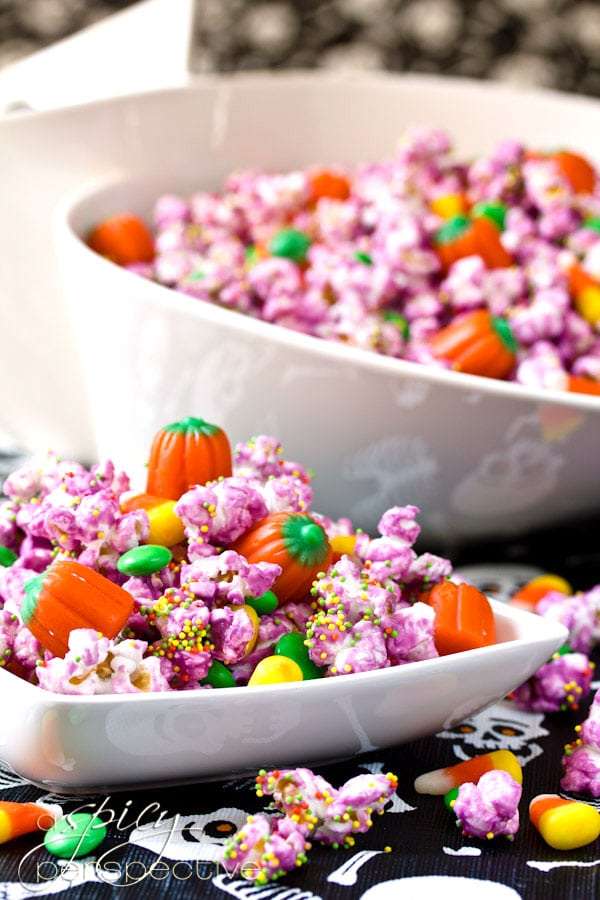Candy coated party popcorn mixed with favorite Halloween candies!