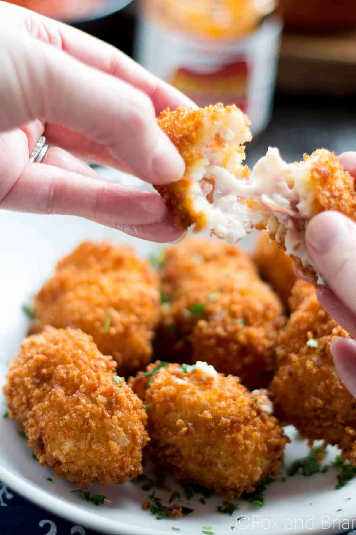 - Add up to six, one at a time, into the oil and fry until golden brown, 2-3 minutes. When removing from oil, place onto prepared rack and leave in the warm oven until ready to serve.