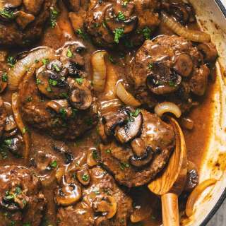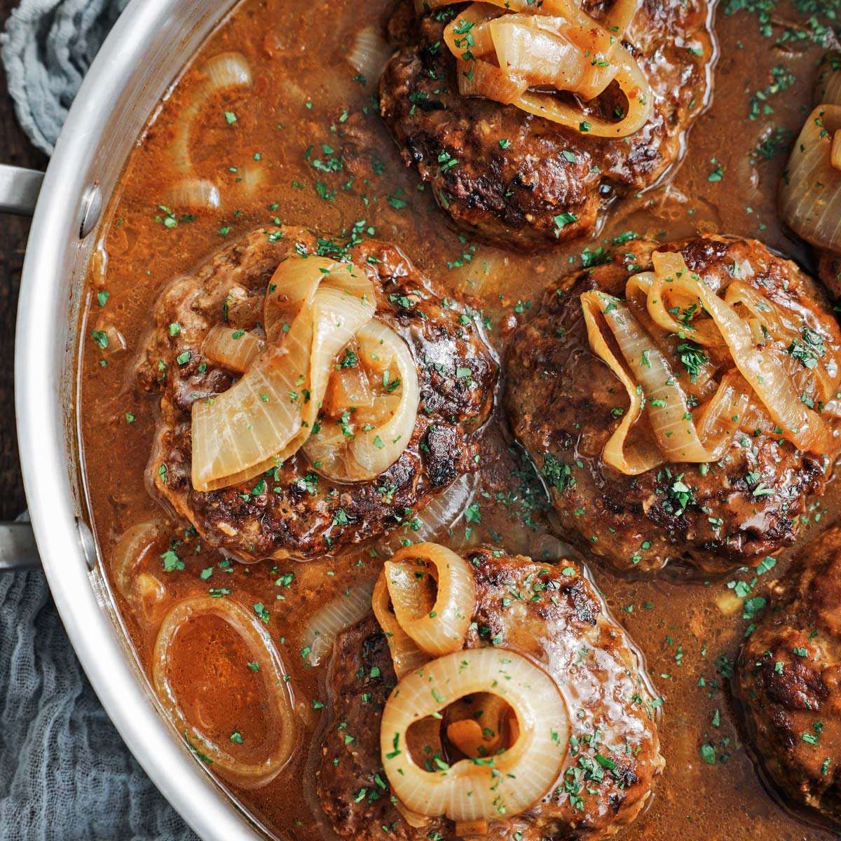 This juicy and flavorful ground beef patties hamburger steak is seared and then simmered with caramelized onions in an irresistible gravy.