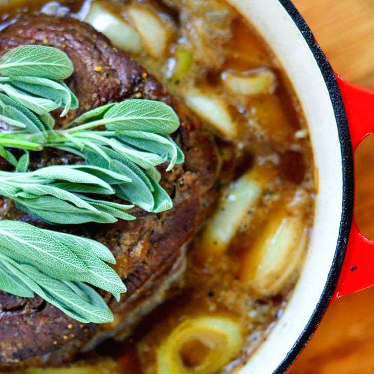 - Add the stock and cider, along with 2 bunches of fresh sage. (Reserve the third bunch for later) The liquid should almost come up to the top of the meat, but not quite. Add more stock or a little water if necessary.