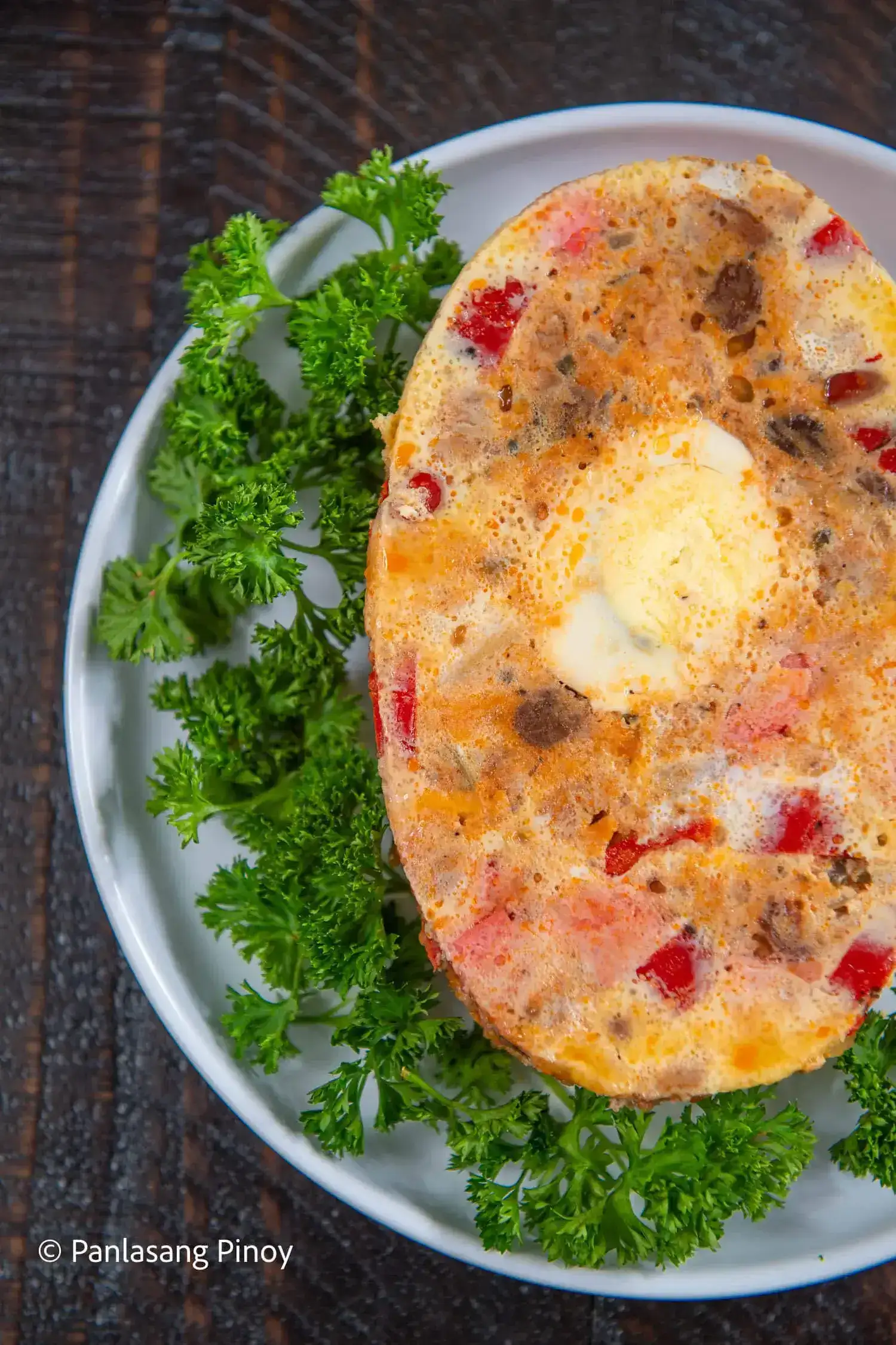 - Grease a llanera and arrange the sliced eggs and roasted sweet pepper.
