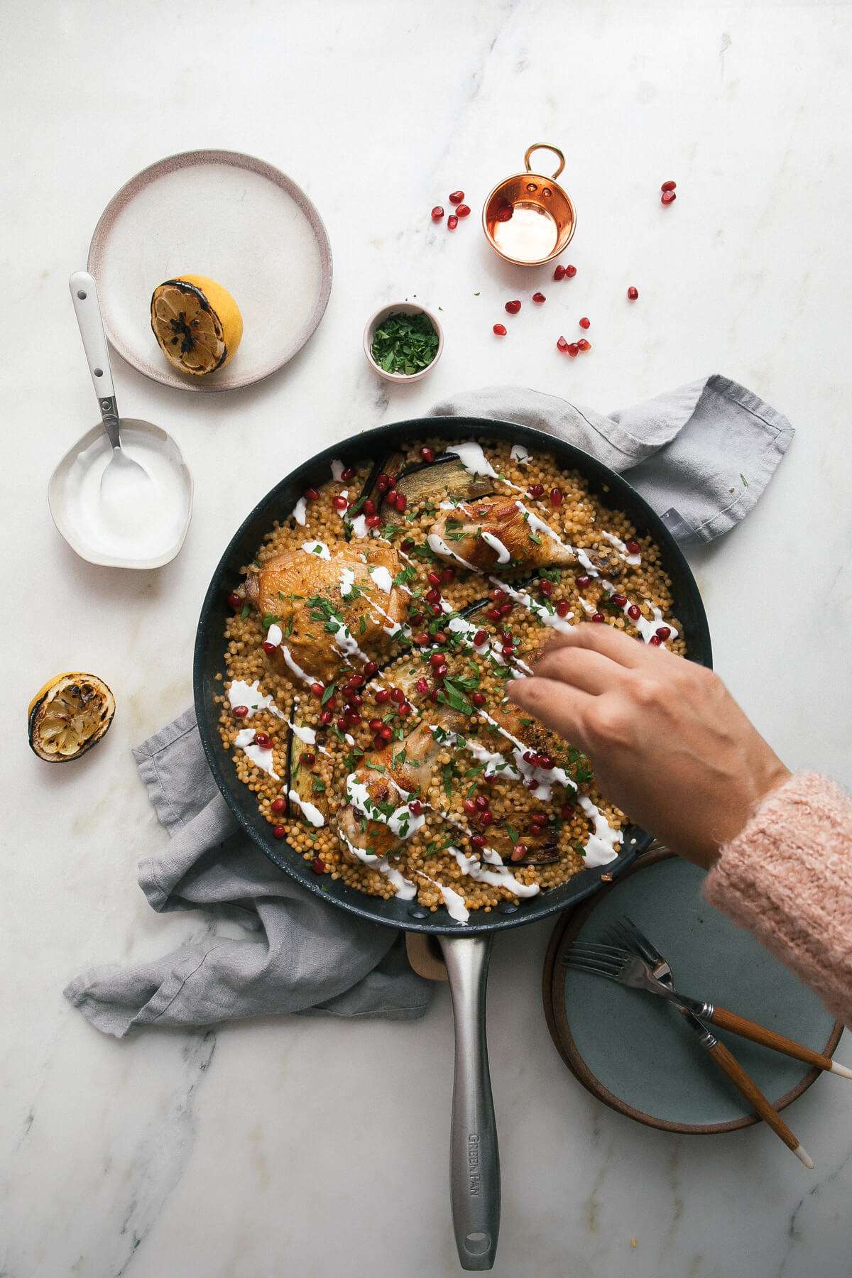 Harissa Chicken Couscous is so good. It features juicy pan-seared chicken thighs cooked with eggplant and harissa-flavored pearly couscous. It's served with grilled lemon, a tangy yogurt sauce and sweet and tart pomegranate arils. This easy dinner is spicy and flavorful and everything comes together easily in one-skillet. Serve with this Moroccan Carrot Noodle Salad with Golden Raisins, Goat Cheese and Harissa for the perfect Moroccan-inspired meal!