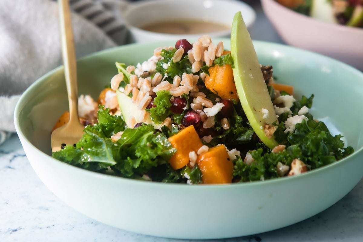 - To assemble, divide the ingredients among 4 bowls. Build each bowl with 1 cup massaged kale, 1/2 cup farro, 1/2 cup butternut squash, 1/4 of the apple slices, 2 tablespoons pecans, 2 tablespoons pomegranate seeds, and 2 tablespoons feta cheese. Drizzle each bowl with 2 tablespoons maple vinaigrette.