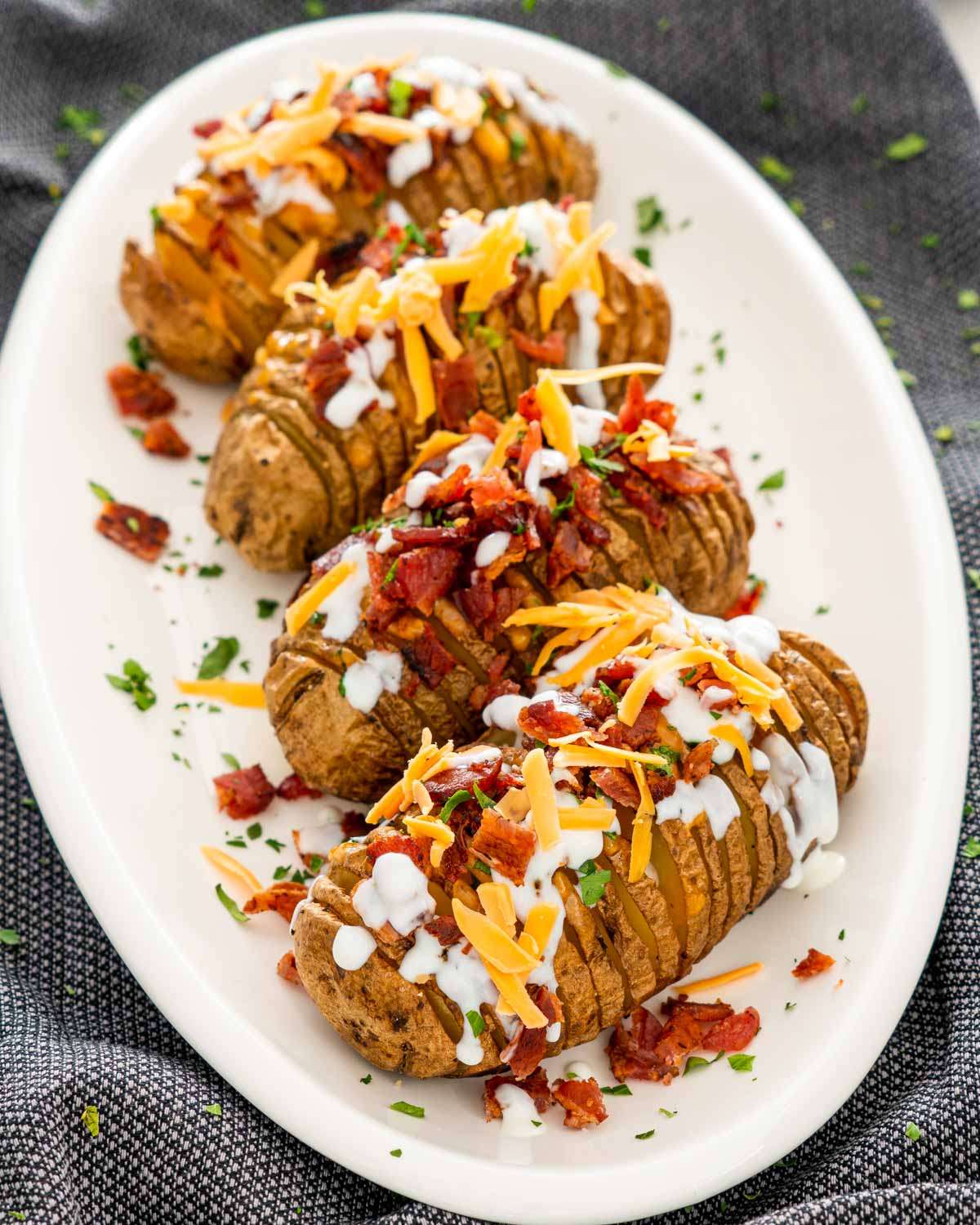 These Hasselback Potatoes are an easy way to impress your guests. Thinly sliced, roasted to a golden perfection and topped with cheese, lots of bacon and sour cream.
