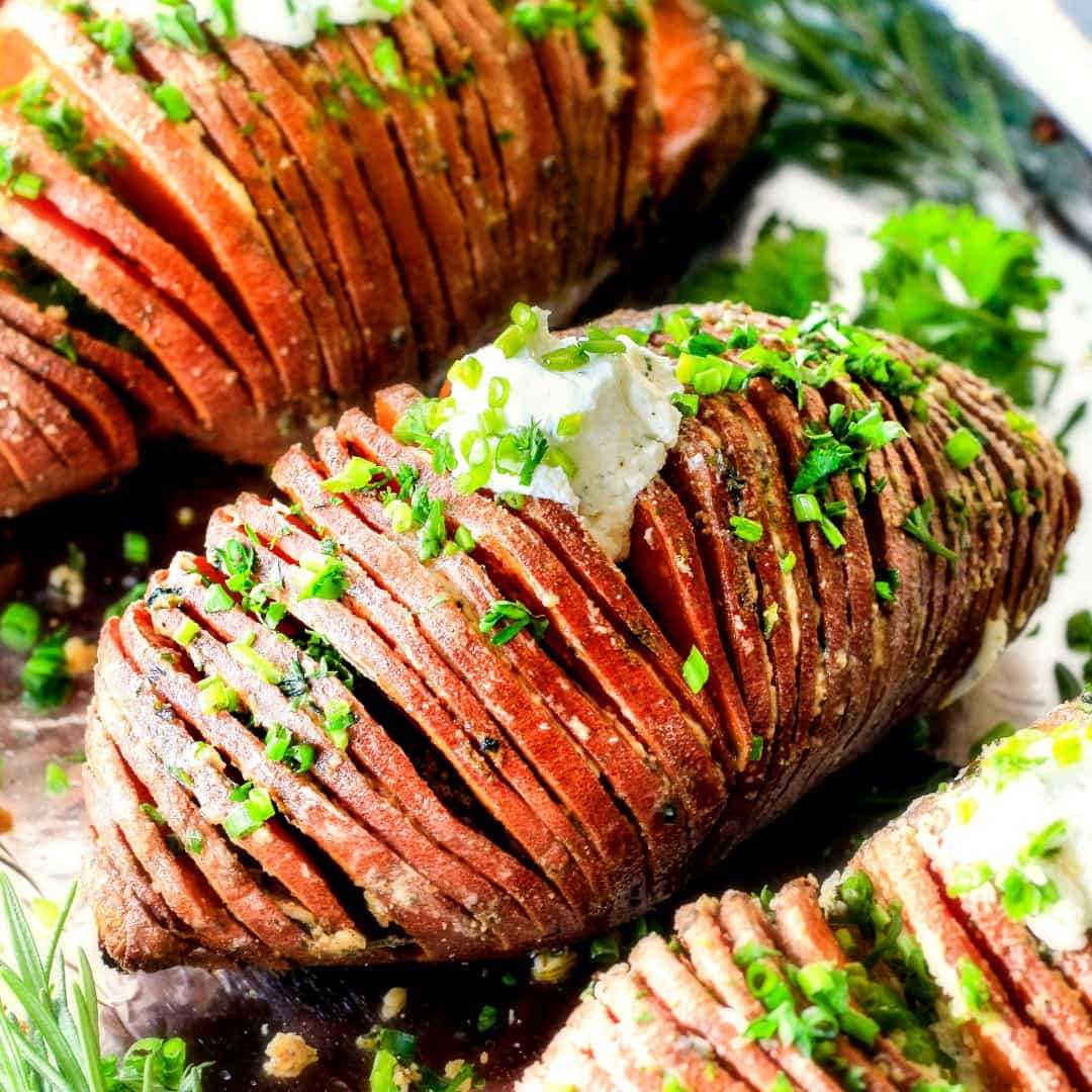 These Hasselback Sweet Potatoes are tender, melt-in-your-mouth and bursting with garlic herb, butter flavor! They look wonderfully gourmet for Thanksgiving and special occasions but are everyday easy!