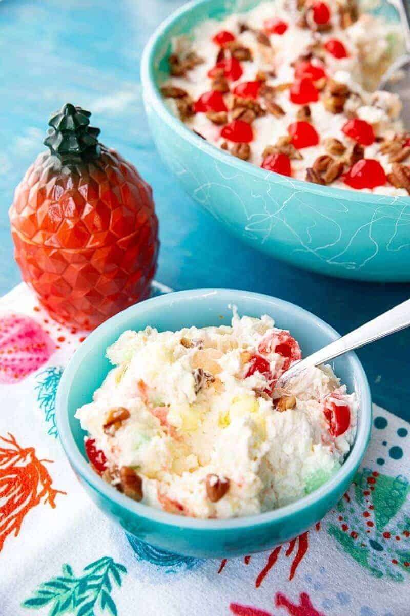 This decadent tropical Hawaiian Cheesecake Fluff Dessert Salad has a delicious, creamy cheesecake filling is mixed with pineapple and coconut and topped with cherries and pecans - the perfect dessert salad!