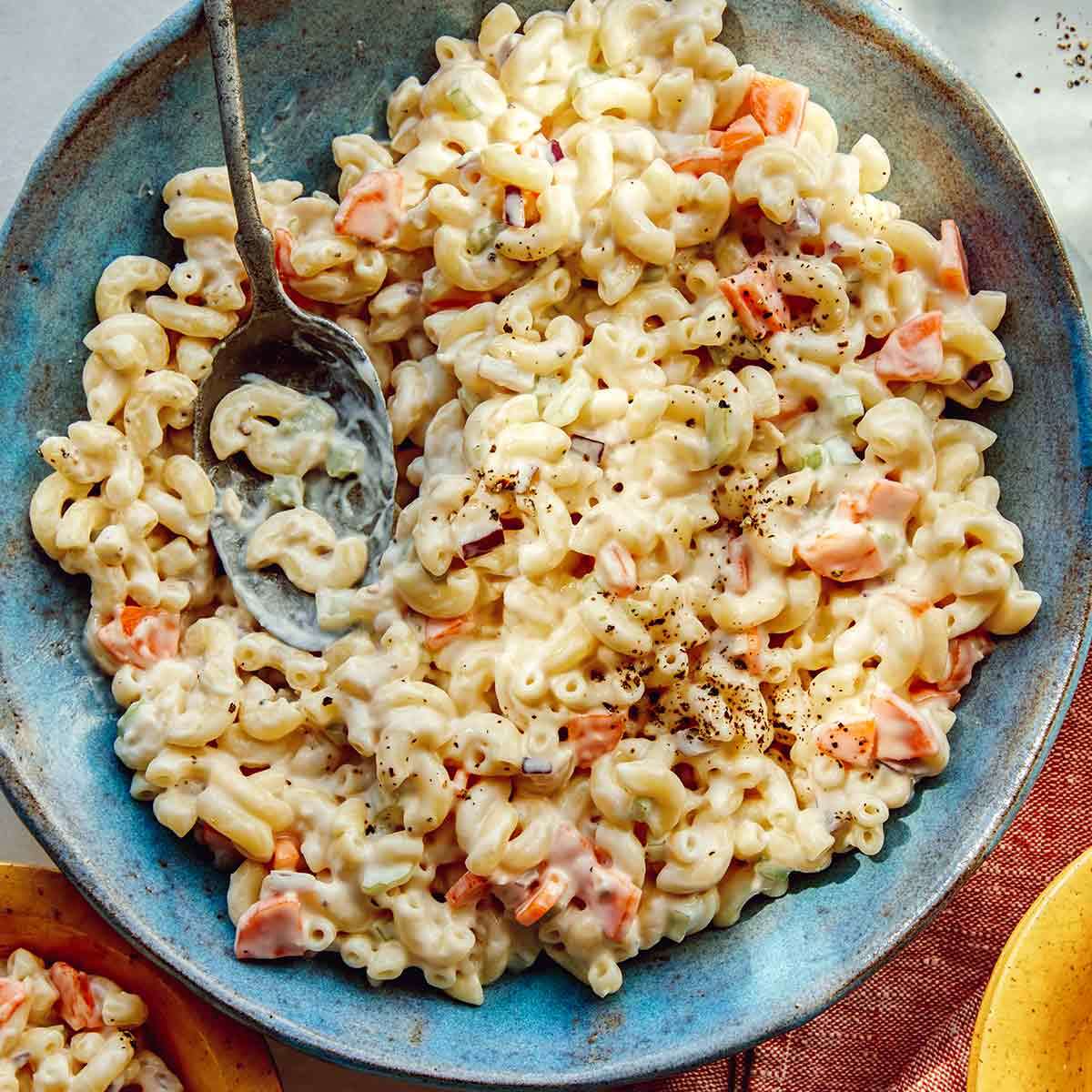 - In a large bowl combine macaroni, celery, carrot, red onion, and mayo mixture.