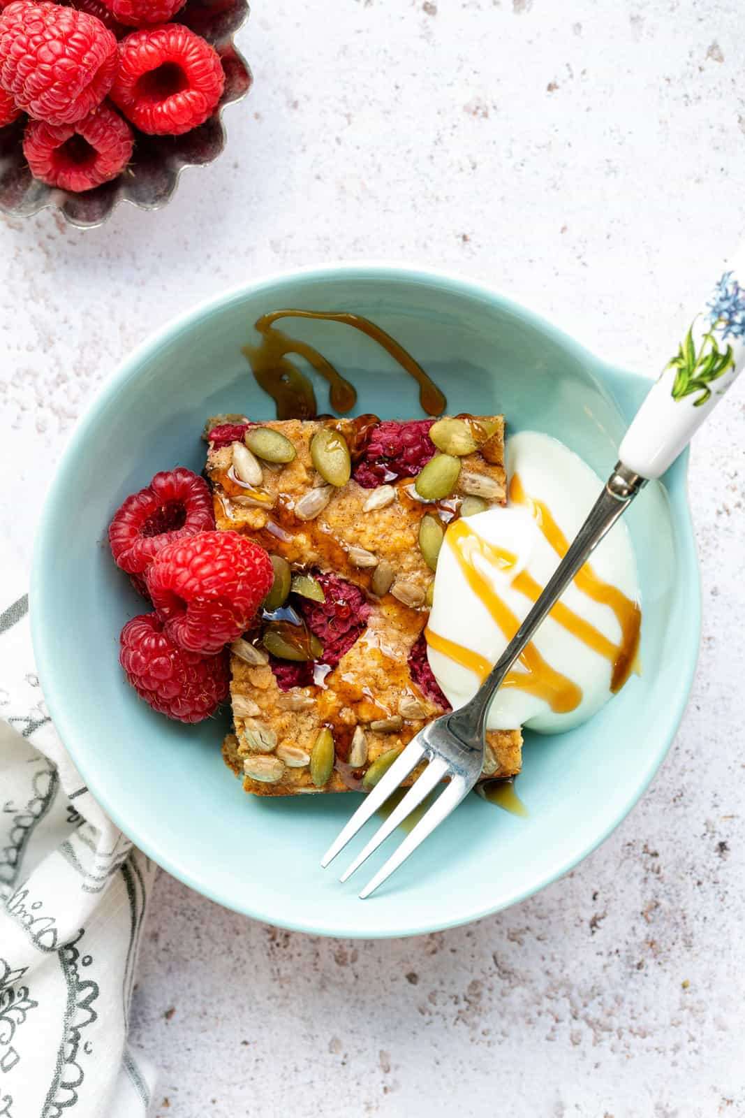 - Top with fresh or frozen fruit pushing them halfway into the oats. I used raspberries but blueberries are also a great option.