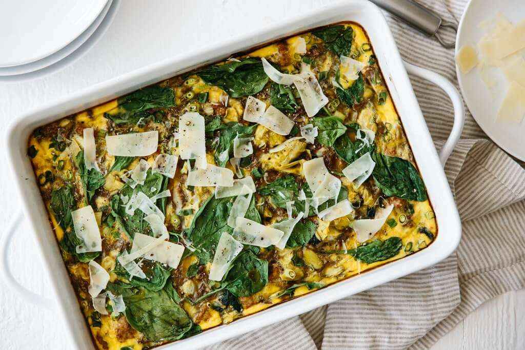 This breakfast casserole is delicious, healthy and easy to make. Filled with turkey, spinach and artichoke, it's naturally low-carb, dairy-free, gluten-free, and paleo friendly.