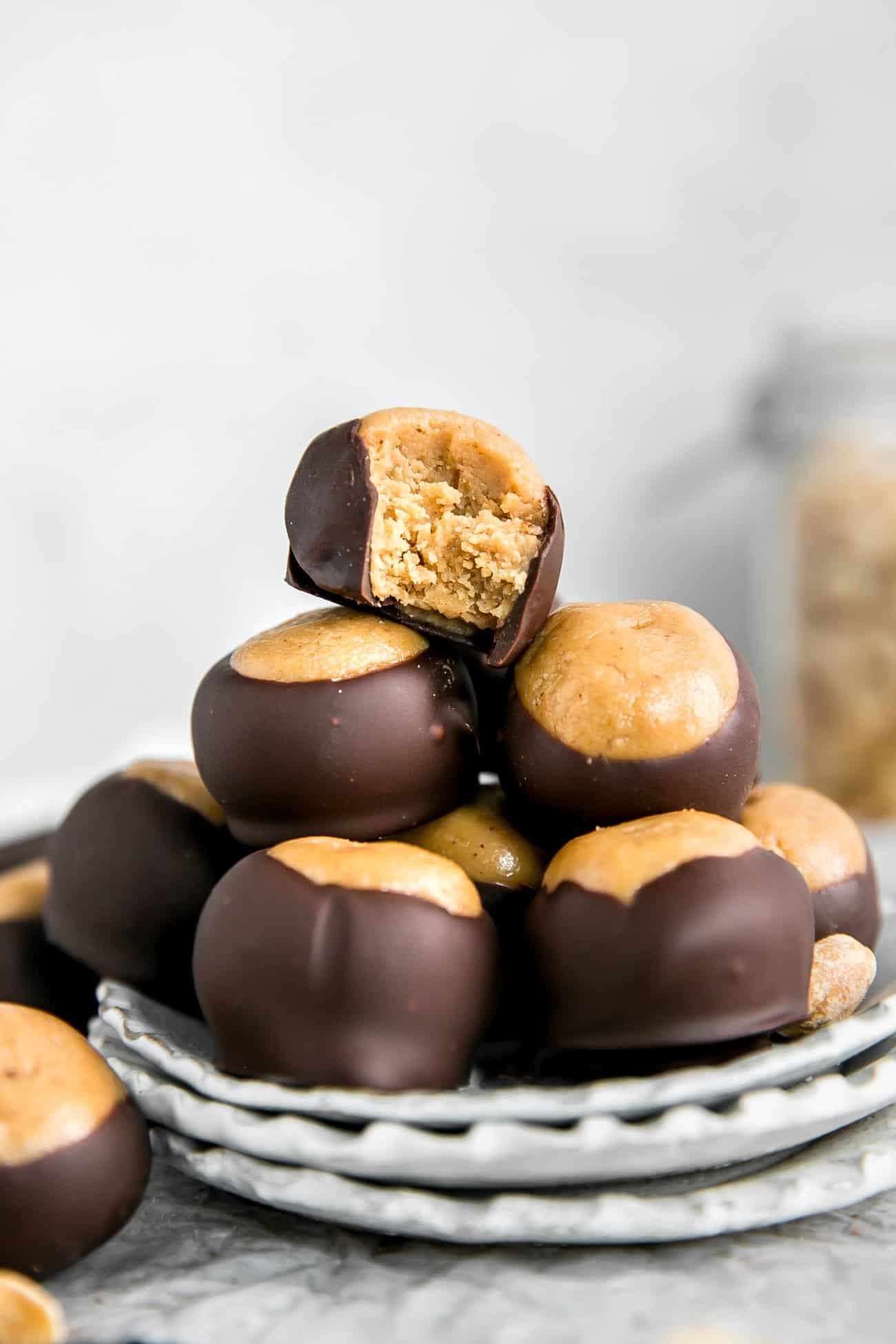 These Healthy Buckeyes are made with only 7 ingredients! Chocolate peanut butter balls are a delicious treat and they are a must for the holiday season - or any time of year! Quick, easy, gluten free and vegan friendly.