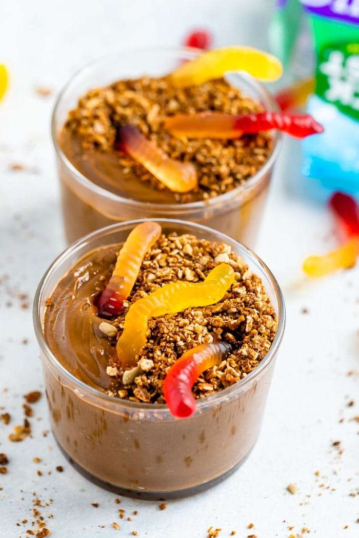 - Once pudding is chilled, top with crushed granola and gummy worms. I did three worms per cup and placed some into the pudding and some on top. Serve immediately.