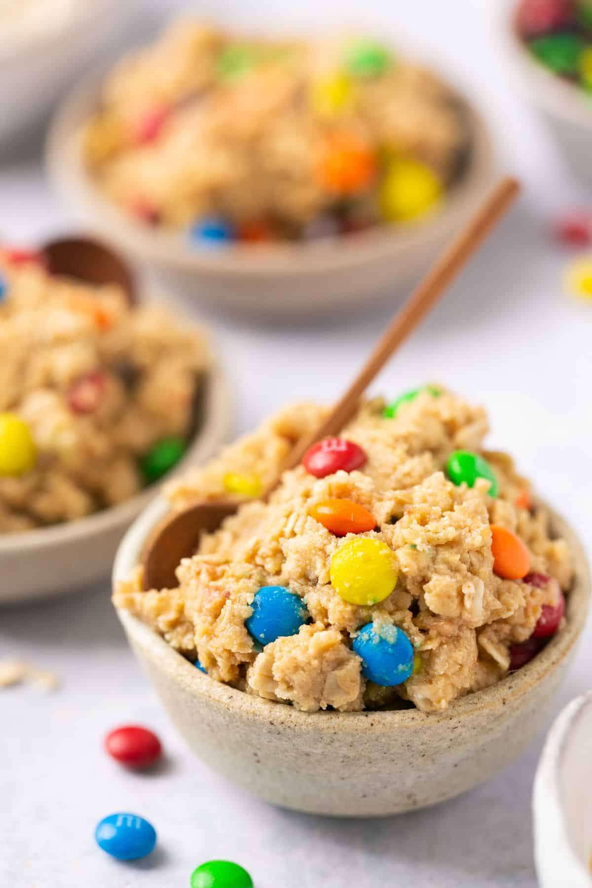 This Healthy Edible Monster Protein Cookie Dough recipe is a healthy, high protein cookie dough with a fun monster cookie twist! This edible raw cookie dough is a great healthier alternative to cookie dough that tastes just like the REAL DEAL without spiking blood sugar levels. It's made with simple ingredients, packs 14 grams of protein per serving and is the perfect way to curb your sweet tooth!