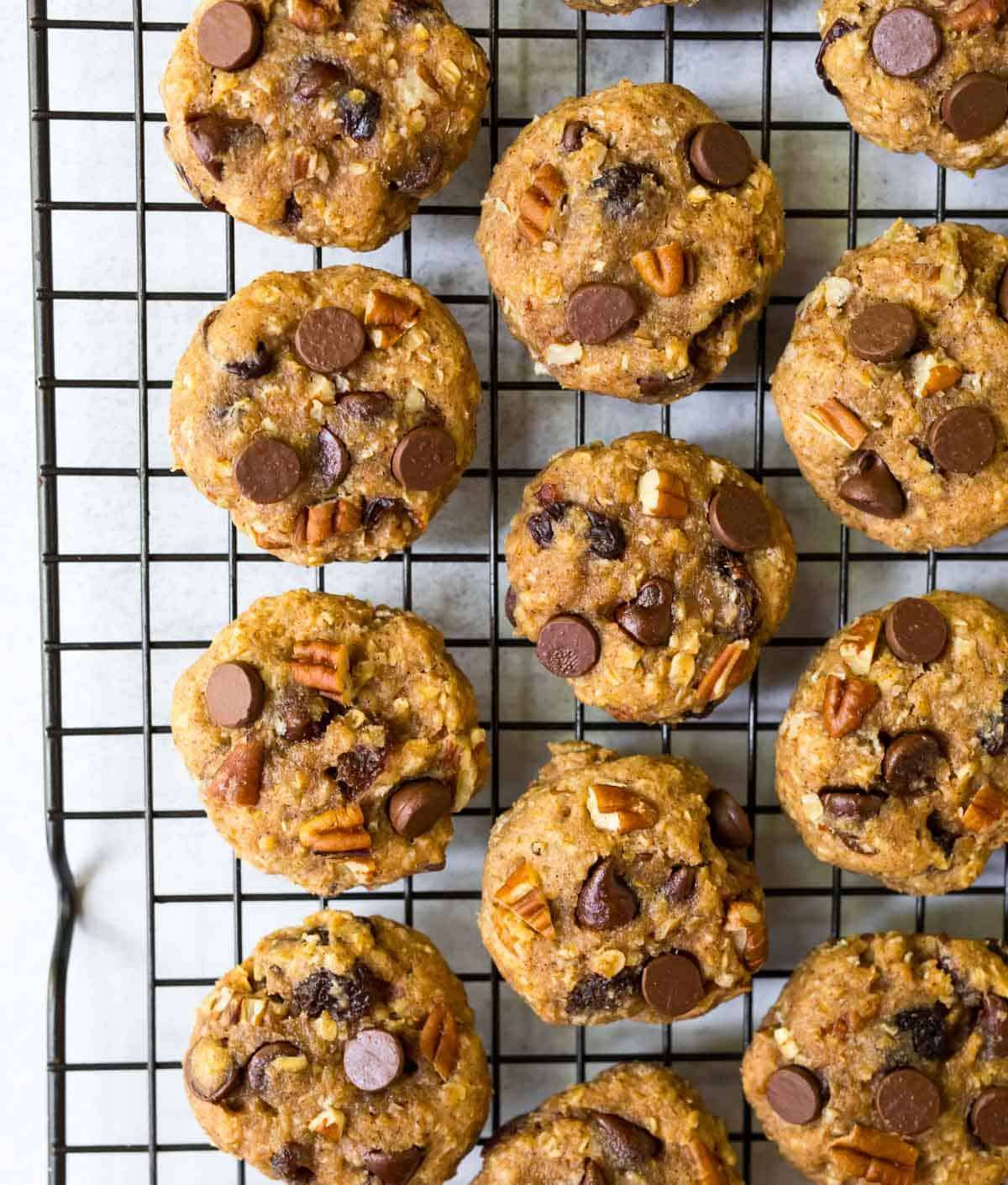 Soft and chewy healthy oatmeal cookies with applesauce, honey, raisins, and chocolate chips. No sugar! The best healthy cookie recipe.