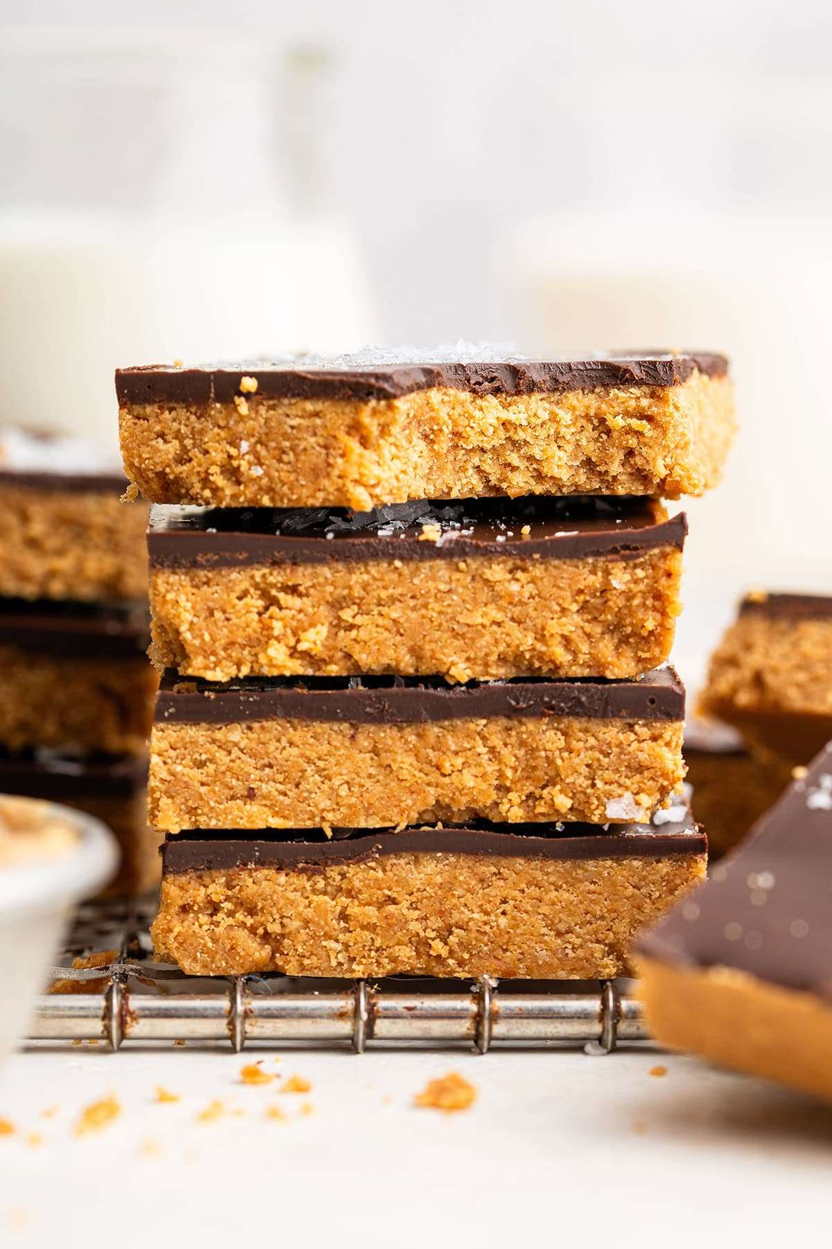 These no bake healthy peanut butter bars are made with 5 simple ingredients and super easy to whip up. No powdered sugar or butter needed!