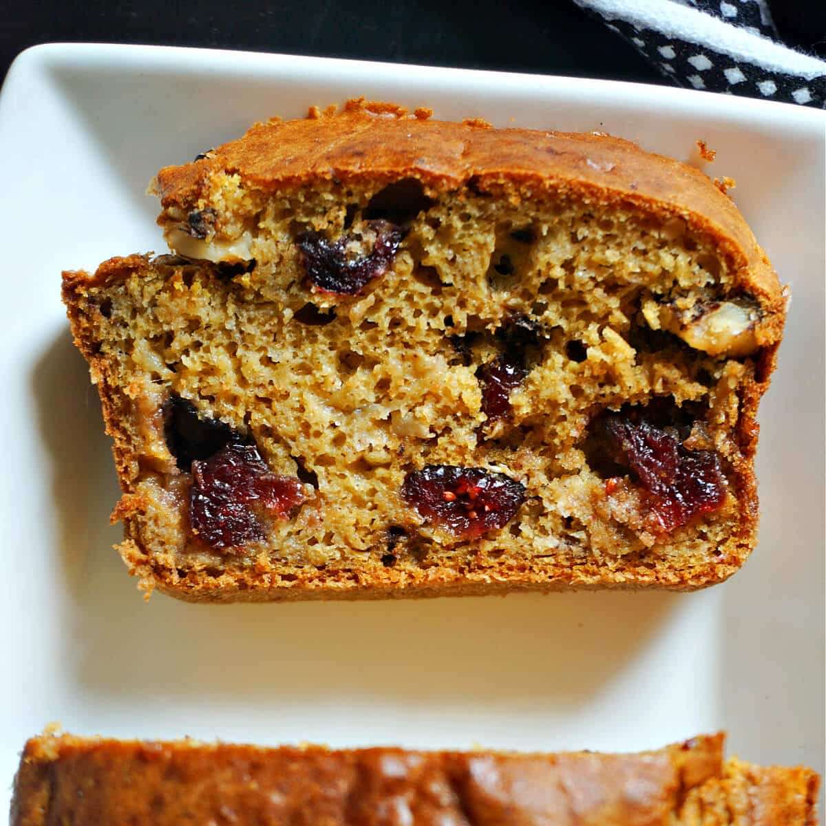 Healthy Pumpkin Banana Bread with walnuts and dried cranberries, a delicious no refined sugar added dessert that is moist, incredibly flavourful and super easy to make too. It's a great Autumn treat at this time of the year, and the aroma of freshly-baked spiced cake adds a cosy touch to your kitchen.