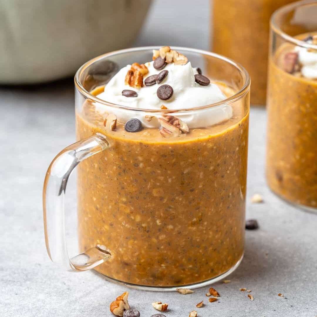 Easy and flavorful overnight oats made with coffee, oats, pumpkin puree, yogurt, and chia seeds, Mixed in with some pumpkin pie spice for a delicious fall breakfast.
