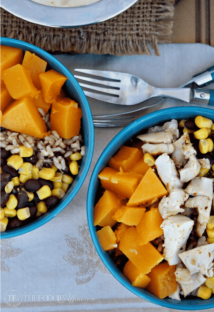 - To assemble: Add 1/4-12 cup quinoa to the bottom of the container or bowl. Top with 1/4-1/2 cup of butternut squash, chicken and bean/corn mix.
