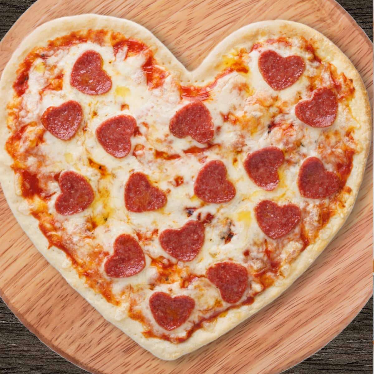 - Cut heart shapes out of the pepperoni (optional) and place then on top. Place the pizza on top of a pizza pan or baking sheet.