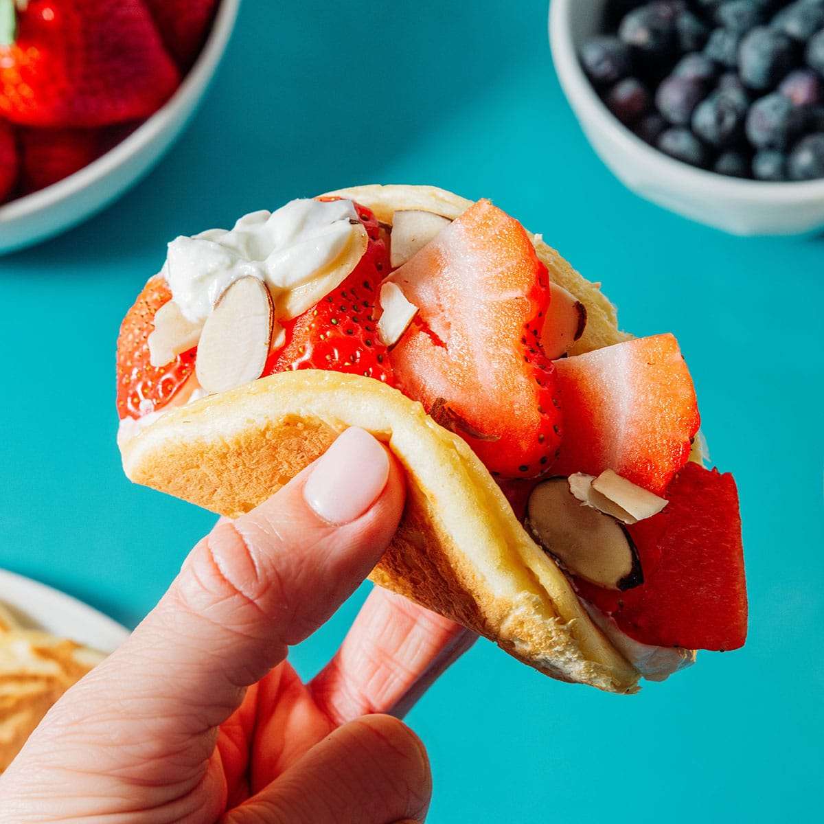 - Pancake Taco Fillings: sliced fruit, nut butter, whipped cream, vanilla Greek yogurt see notes for filling ideas