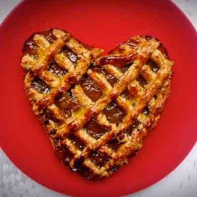 - Étaler les ⅔ de la pâte dans le fond du moule. Recouvrir de confiture de rhubarbe. Rouler la pâte restante en lamelles et disposer ces lamelles en croisillons sur le gâteau. À l'aide d'un pinceau fin, badigeonner les croisillons de jaune d'oeuf.
