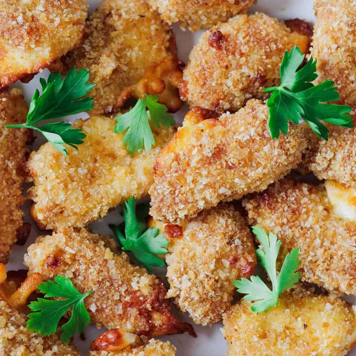 - Finally, roll the curd in the breadcrumbs until fully coated, shaking off any extra in the end. Set aside on a plate and repeat with the remaining cheese curds.