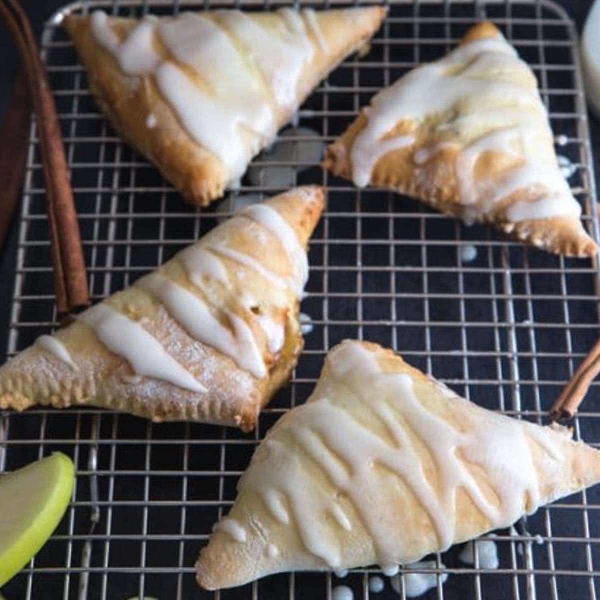 - Fold one corner over the other (to form a triangle) and seal edges with a fork dipped in flour (or use a pasta wheel). Place the turnovers on a parchment paper lined cookie sheet. Brush the turnovers lightly with milk and bake for approximately 15 minutes or until golden. Let cool slightly, eat plain or dust with powdered sugar or drizzle with vanilla glaze. Enjoy!