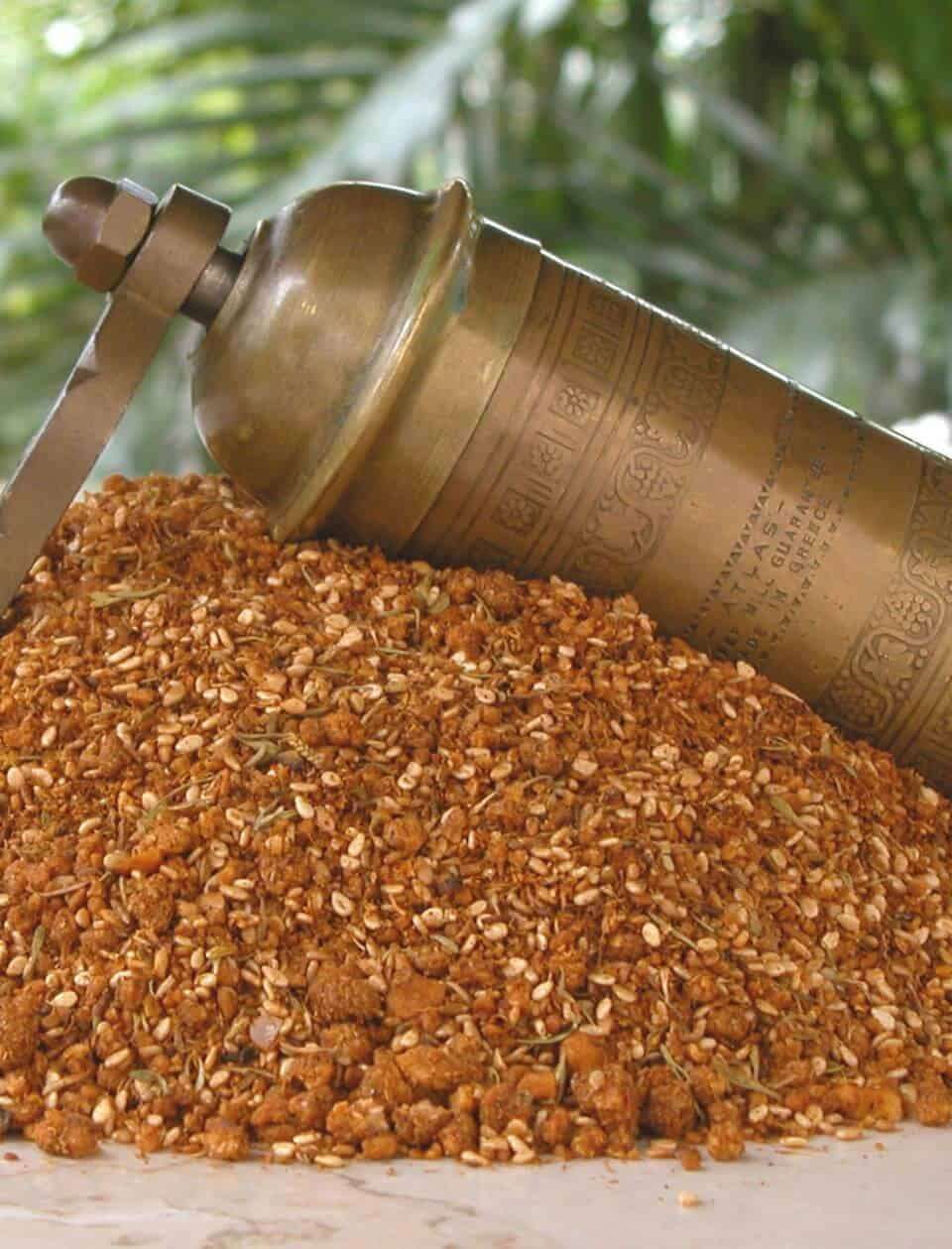 - In a spice grinder or coffee grinder, grind all toasted ingredients except the sesame seeds very roughly. If ground too fine the nuts will lump together due to the release of the oil within the nut.
