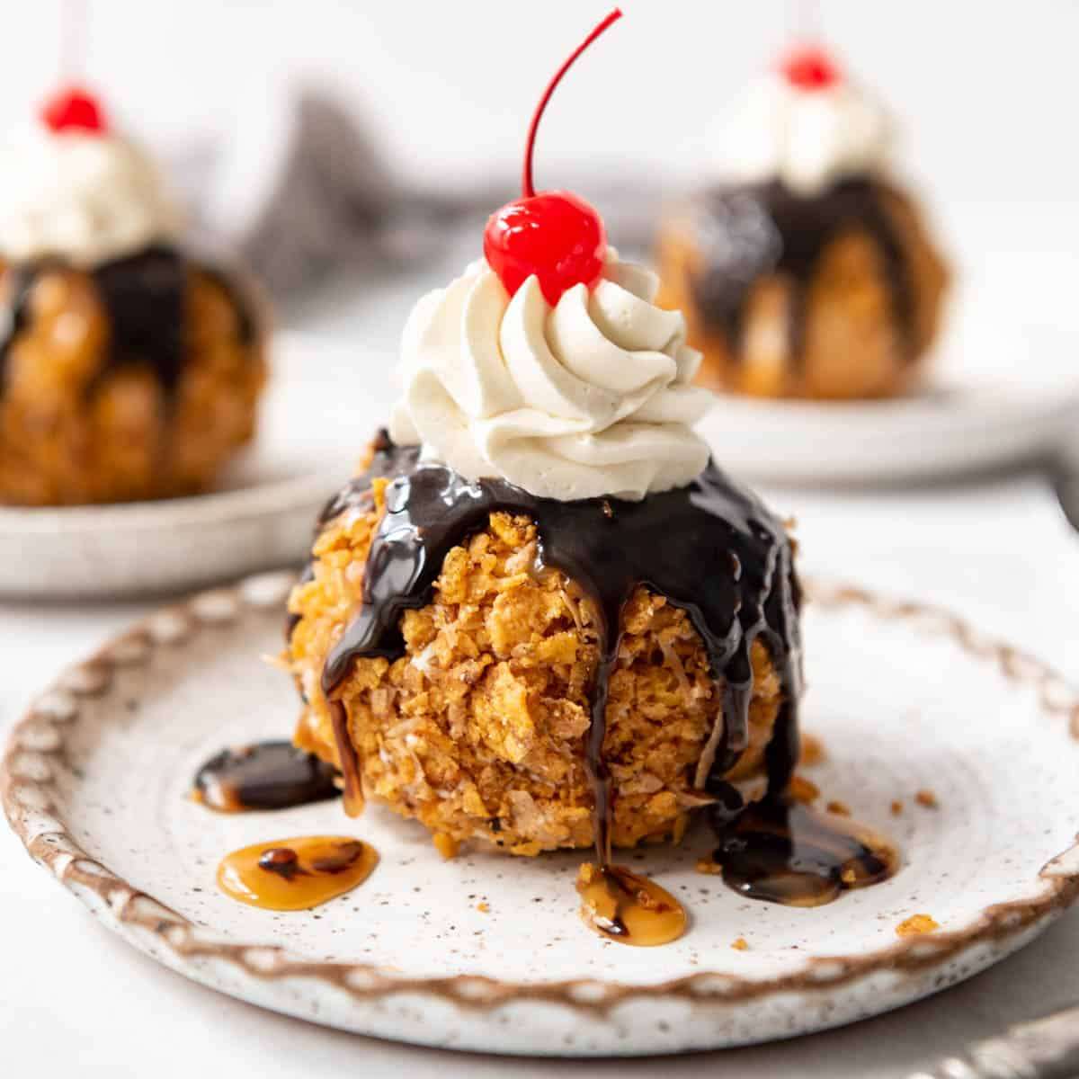 - Top each ball of fried ice cream with chocolate and caramel sauce, whipped cream, and a cherry. Enjoy!