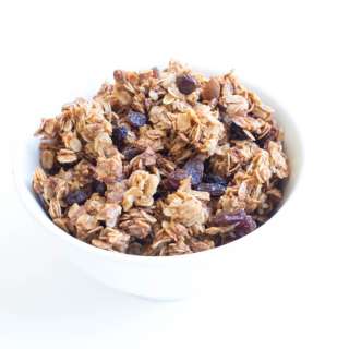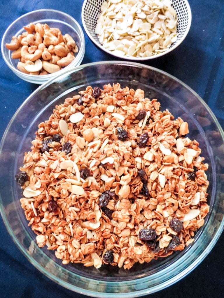 - While the granola cools down, mix the nuts and the raisins in a medium bowl.