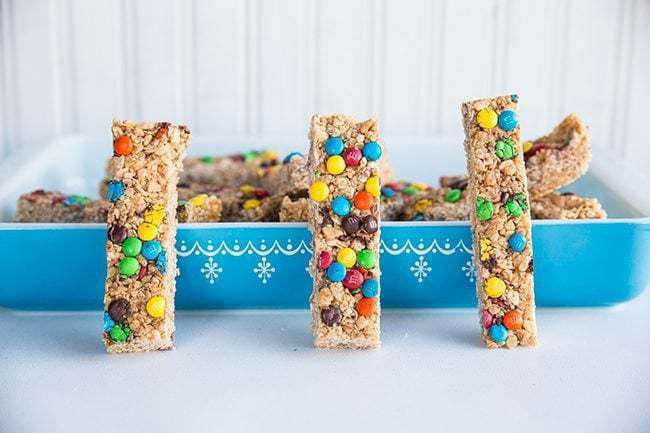 - Sprinkle the M&M's over the top and press firmly into the tops of the bars. Make sure that the bars are tightly compacted in the pan.