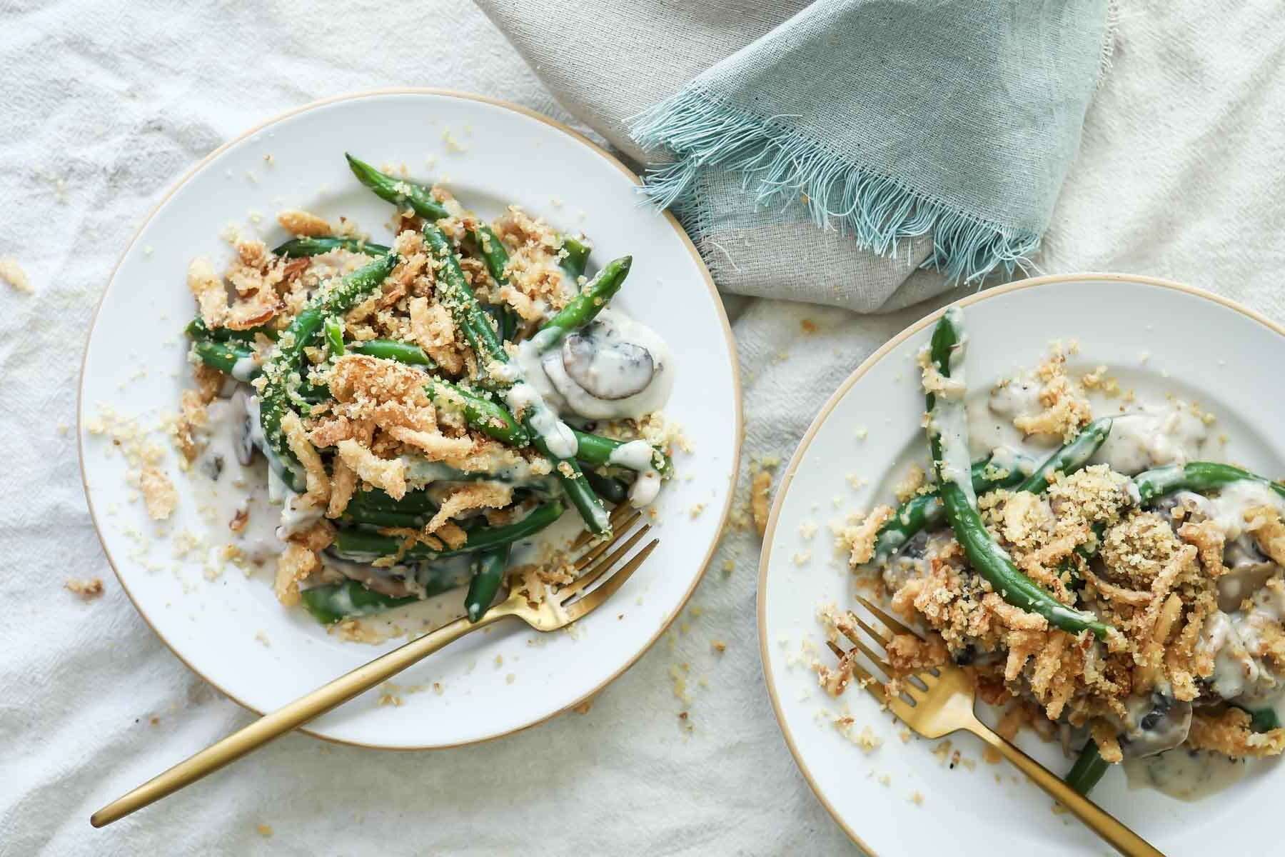 This classic oven-baked Green Bean Casserole is made with a homemade creamy mushroom sauce, plenty of fresh green beans, and crunchy topping made with both bread crumbs and canned fried onions.