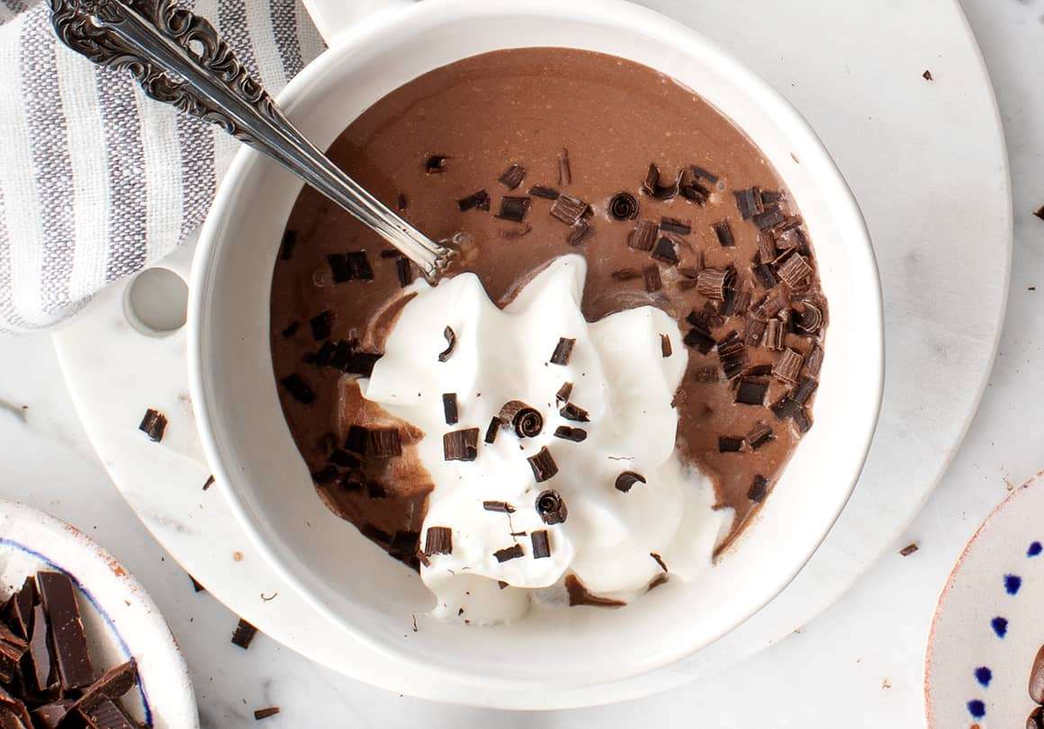 - Add the maple syrup and bourbon, if using, and stir to combine. Serve hot with whipped cream or chocolate shavings, if desired.